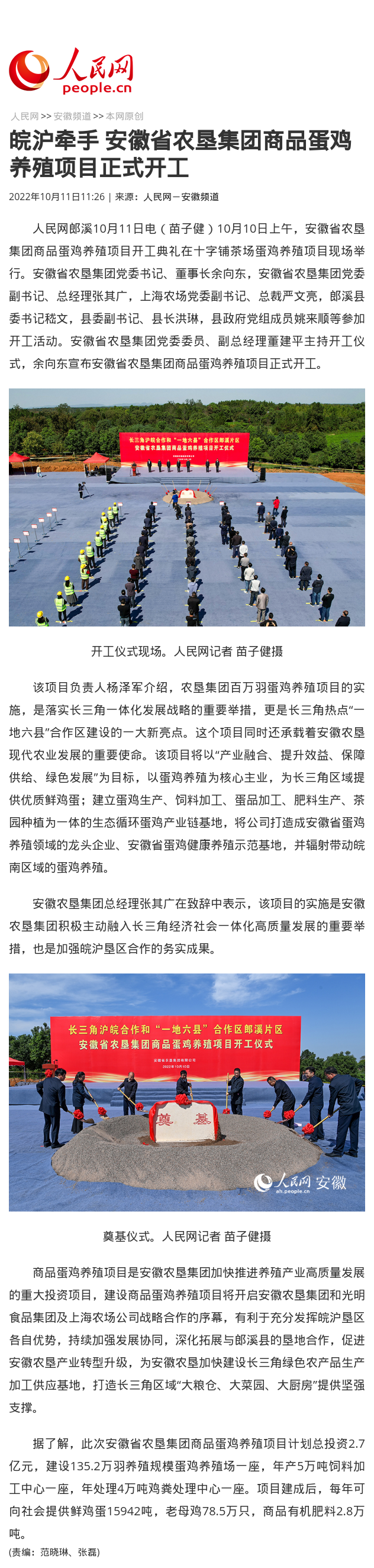 人民网:皖沪牵手 安徽省农垦集团商品蛋鸡养殖项目正式开工