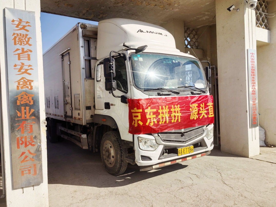 满载“安禽”牌黄油老母鸡的货车正驶向京东“拼拼”仓库