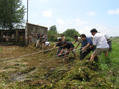 7月1日至2日,潘村湖农场武装部紧急动员民兵应急分队赶赴承担圩区外排任务的场属苏拐电站参加沟渠清障工作,以确保河道通畅,加快排水速度。图为热火朝天的劳动场面。(杨登宏摄)